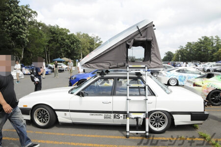 今回のGarage激賞はこちらの一台。ルーフトップテントに貼られた星街すいせい仕様のスカイライン。北海道へ旅に来たら偶然やってたこねミに辿り着いたと言う一台。