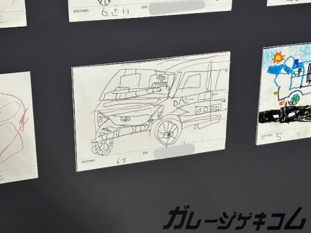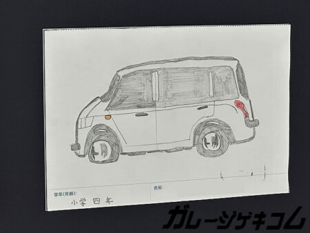 きっと家の車を描いたのだろうなと言う感じを受けた一台。ハイラックスかアルファードなどのミニバンなのか。僕が6歳の時は斜めに車描けなかったなと思ったり。じゃあ今描けるの?と言われたら描けません。