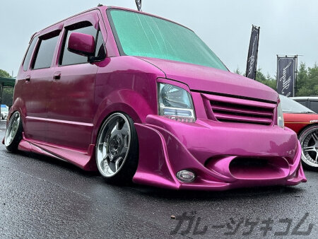 エグイ造形が目を引くブラックマフィア武装のワゴンR。THE改造車と言うこのエアロ結構好きだったりします。この手のエアロも販売終了から12年。綺麗なのが現存しているんですね…。