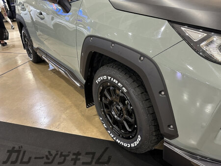 JAOS仕様にされたRAV4。ボンネットはラッピングされアウトドア派なカスタマイズされた一台。JAOSのオーバーフェンダーの形状。ビス止めかと思いきや、見える部分はダミー。裏手に純正ボルト共締め。