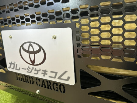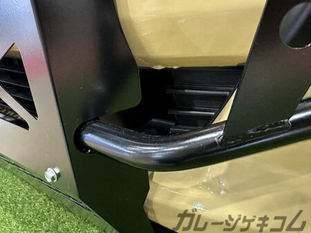 バンパーガードもかなり頑丈な物が取り付けられていました。これを取り付ける事で商用車の見た目を払拭できるのではないでしょうか?しかしながらおわかりいただけるだろうか?網目越しに見える本来ナンバーが取り付けられる場所のラッピングが施されていない事に…。