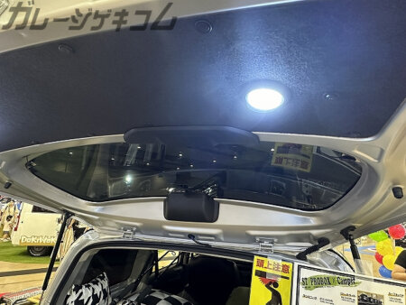 普段使いにも役立ちそうなルームランプの増設。明るい会場内でもこの明るさなので夜の点灯はかなり役に立ちそうなアイテム。プロボックスのリアゲート裏はスペースがあるので独自にカスタムの参考にもなるかもしれませんね。