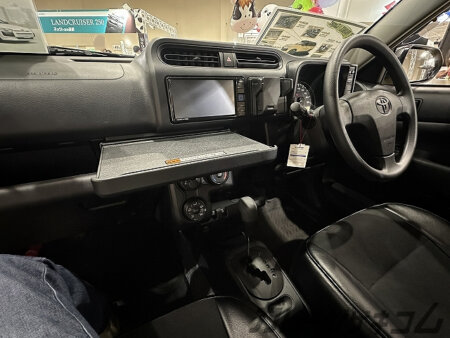 しかしながらプロボックスはこのようにフロントシートに座れば使える大型テーブルが標準で装備されている。外回りで走り回る営業マンがコンビニで弁当を買って車内で食べる事も出来る物なので機能的にはかなり出来が良い。ちなみに50系(先代)モデルより少し助手席よりにセットされて大型化されている。