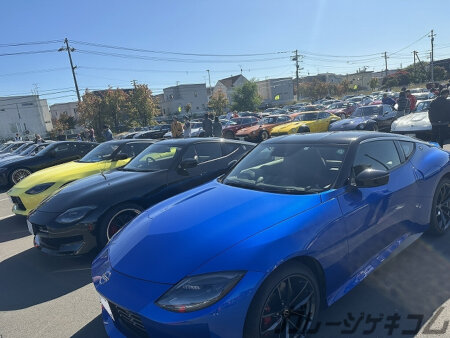 色々な画角の中でも「Zしか写ってない」と言う角度を求めたアングル。平坦な会場内で一台でも多くの車輌を写すのに右往左往していた訳だが駐車帯に収められて綺麗に並べられた様子も悪くない。車種統一だときっちり並んでいる方がかっこよく見えるかもしれない。