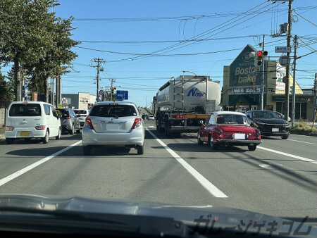 帰りに先程見ていたフェアレディと信号待ち。国産クラシックカーはどんな車と並んでもコンパクトに見えてしまいますね。