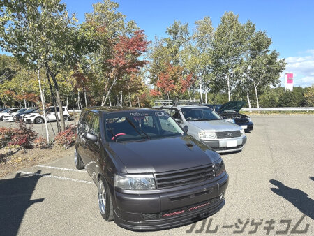 この画角から見ると手前からサクシード、プロボックス、プロボックスにように見える。どの車も下げ方向にカスタムされています。真ん中のシルバーさんは今回初見のホイールチェンジ。個体自体は今年のエゾイスト駐車場でチェック済み。どちらの見た目もイケていて履きたいホイールの数だけ個体を用意しなければ追い付かなくなりそうだ。