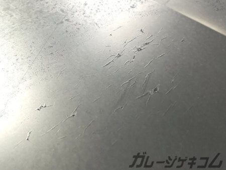 水洗いをすると結構跡が目立つ部分も…カーラッピングであってもボディケアしないとこのように消えない水垢みたいなのが浮き彫りに。今ではカーラッピング用な簡易コーティング剤などでお手軽にメンテナンスは出来るのですが、ここまで酷い物だと貼り換えて、一からコーティングした方が綺麗になると思います。