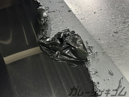 じっくり炙るように熱を入れると左のようにささくれのような物がほぼ出ないではがせるのですが、ボンネットと言う広範囲を剥がすとなるとほぼ右側のようにパリパリとした破片をまき散らす事になりますね。ベスト作業手順としては一人はヒートガンで温めて、一人は剥がしていくと言う流れでしょうね。