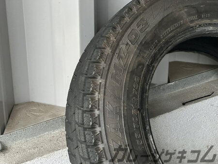 保管用のタイヤは155/70R12。タイヤ屋さんに出入りしてた時に空気が入る廃棄タイヤを頂いた。今では廃棄本数なども厳重に管理されていると聞く(場所による)。はいどうぞと貰う事も難しくなってきているらしい。公道を走る事はしないただ冬季間置きっぱなしになる車を支えてくれればいいと使われ続けてきた一品。