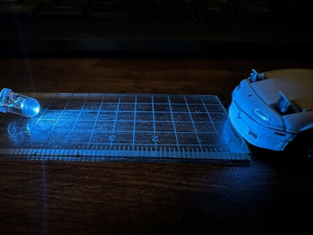 LED単体の足をボタン電池で挟む比較。これは使用を始めて一年経過した物の点灯の様子になります。3mm砲弾の青色LEDがあったから青ですが、実際は白でも緑でも何でも。3V未満で点灯する砲弾型LEDなら何でも良いかと。昨今ではホームセンターでも売ってますし。