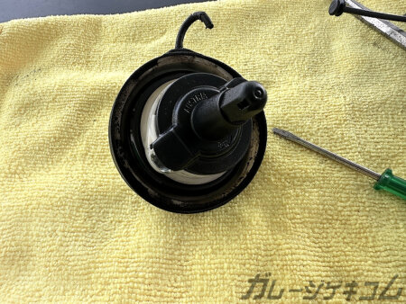 『16117193372』のフューエルキャップASSYがこの車には装着されているので、経年劣化のリフレッシュとして全交換しても良かったかな?とも思ったり。思った時にはすでに遅くストラップのみ注文したので薄刃ドライバーで分解作業を行います。日々何回も行ったOリング外しの要領で取り外していく。