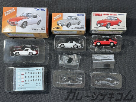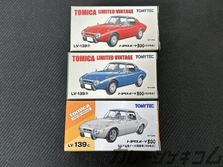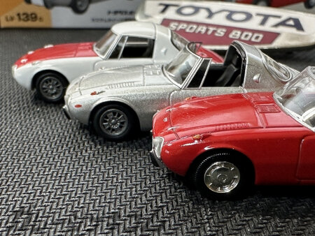 2025年12月に発売したのはトミカ ヴィンテージ リミテッドシリーズで2台(写真上)、2025年11月にトミカ プレミアムで出たヨタハチ(写真左下)、そして2014年2月に発売していたトミカ ヴィンテージ リミテッド(写真右下)
